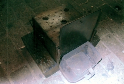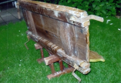 Primitieve eiken boerenwagenstoof. De werd vroeger onder de wijde rokken van de vrouw gezet. Dat hield de boel lekker warm!
