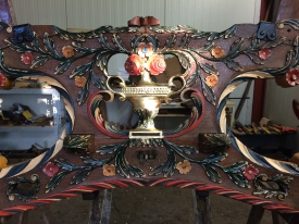 Bij aanschaf zat er nog 1 wiel bij, dat was genoeg om na te maken. Dus 4 nieuwe fijne hoge wielen, ongeveer 1,45 meter hoog, helemaal in stijl, met vermoedelijk de zelfde oude kleuren. De wagen staat nog goed op zn poten , de wielstand is prima, heel fraai snijwerk, originele vrolijke kleurstelling, goud waar goud hoort. Een juweel van een wagen waar we zuinig op moeten zijn.