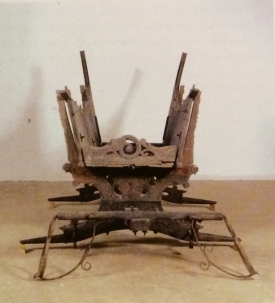 Zijaanzicht van de deplorabele staat van de Alblasserwaardse speelwagen bij aanvang van de restauratie.