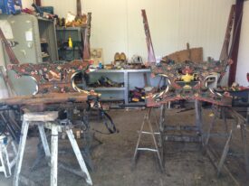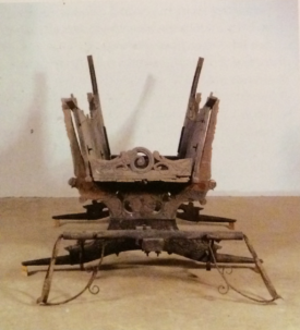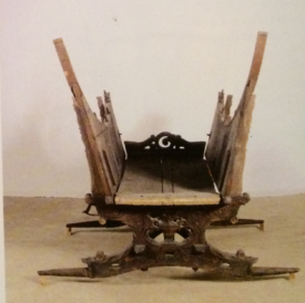 Zijaanzicht van de deplorabele staat van de Alblasserwaardse speelwagen bij aanvang van de restauratie.