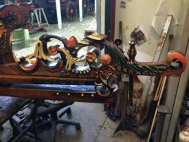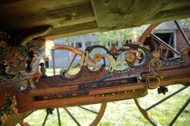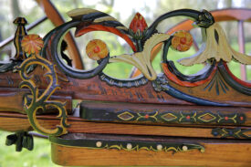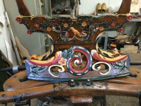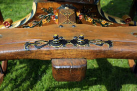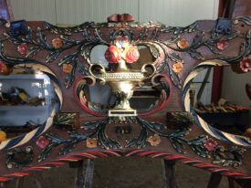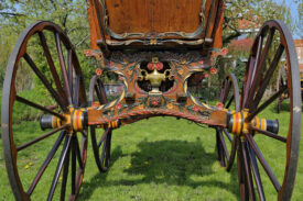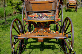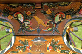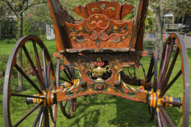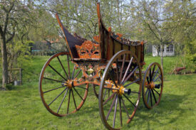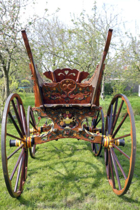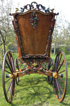 Bij aanschaf zat er nog 1 wiel bij, dat was genoeg om na te maken. Dus 4 nieuwe fijne hoge wielen, ongeveer 1,45 meter hoog, helemaal in stijl, met vermoedelijk de zelfde oude kleuren. De wagen staat nog goed op zn poten , de wielstand is prima, heel fraai snijwerk, originele vrolijke kleurstelling, goud waar goud hoort. Een juweel van een wagen waar we zuinig op moeten zijn.