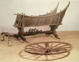Hier zien we het lage speelwagen krat, heel fraai bijna fragiel uitgevoerd, Het speelwagenkratheeft in een vorig leven dienst gedaan als kapstok, getuige de schroefgaatjes, die wel netje zijn weggewerkt! Past perfekt, de onderdelen uit de zelfde streek kunnen meestal goed bij elkaar. wat betreft maat en uitvoering. Iedere wagen had oudtijds een hoog en laag achterkrat, het lage was lichter en je had zicht naar achter, ook weer bijzonder rijk en passend met het geheel uitgevoerd, Het zit aan weerszijde opgesloten simpel tussen twee latjes, en onder in het midden een ijzeren punt door de buikplank om mee te draaien in de bochten.