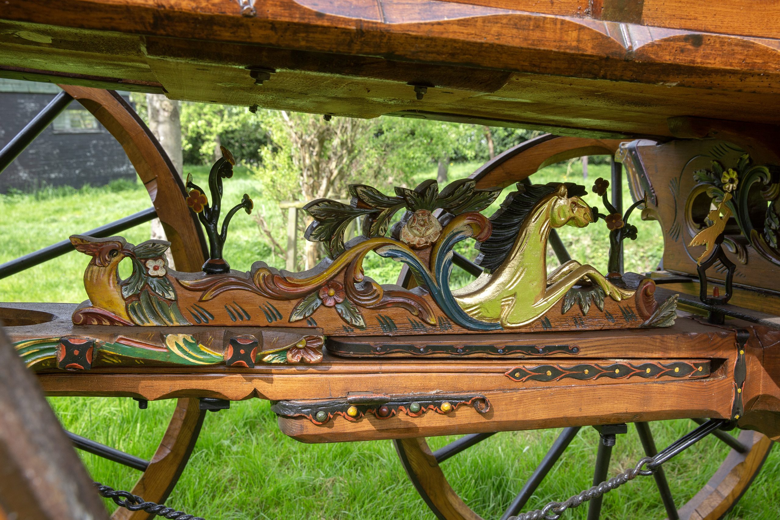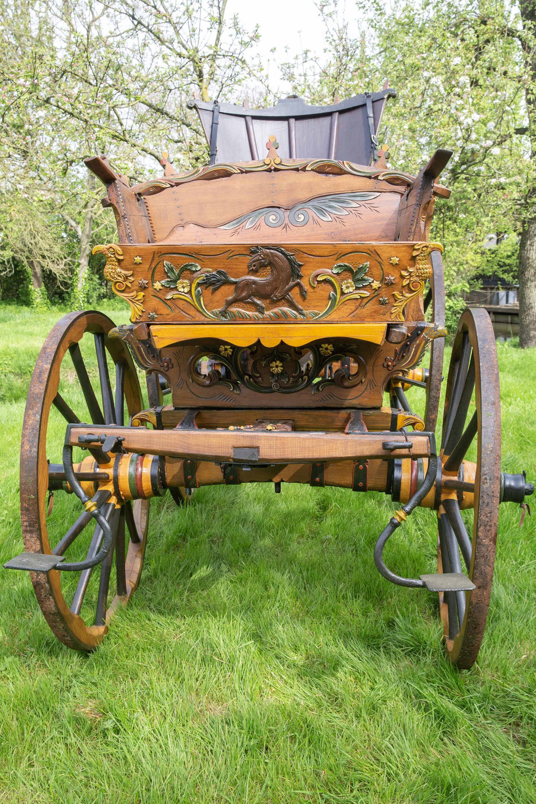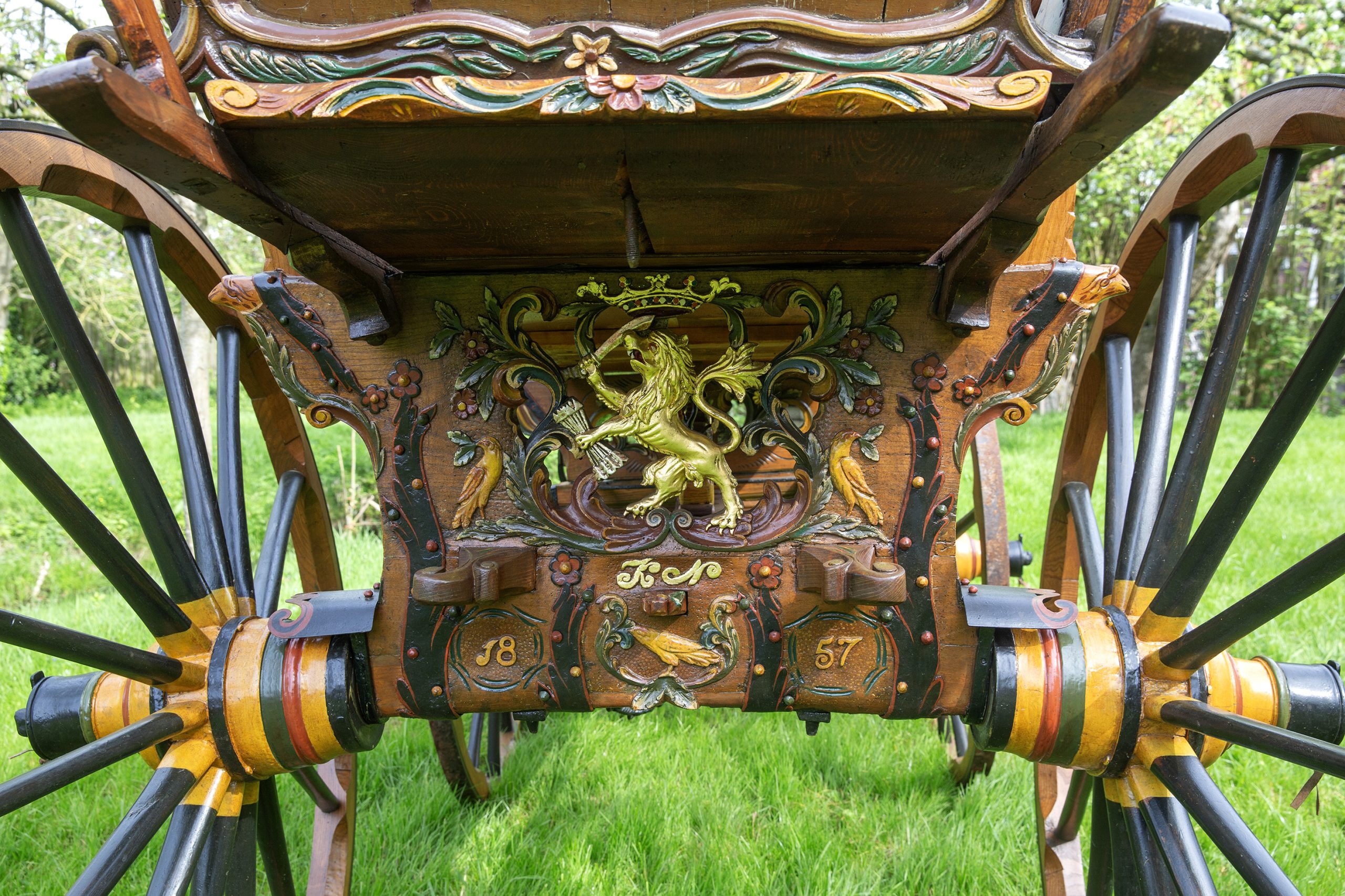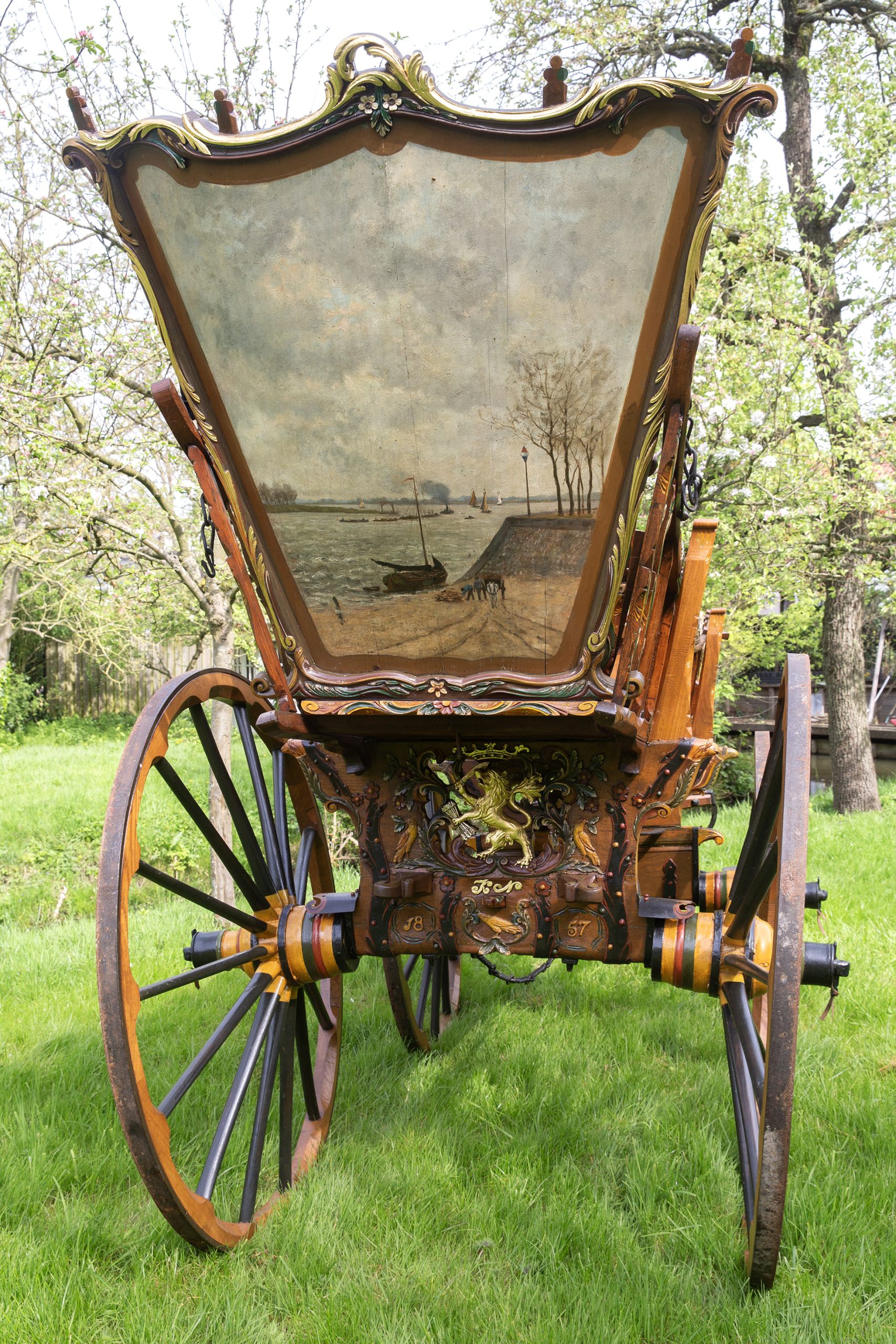 De Wagen 1857 is gebouwd in de Alblasserwaard en gesingeerd door Arie van Peet, wagenmaker te Meerkerk. Het is een heel bijzonder exemplaar mede door het smeedwerk in bloemvorm. Verder is het een zeer fraaie wagen die goed en in de oude luister is hersteld. Het achterkrat met beschildering van een vroege stoomboot met sleep geeft waarschijnlijk voorstelling vanuit Dordrecht met zicht op de Sofia polder waar vroeger de Galg van Dordrecht stond. De vroege originele steekleren en achterkrat zijn achtiende eeuws. Verder is deze zeer fraaie wagen, ondanks zijn leeftijd in prima rijdbare conditie, compleet met twee span kromme dissel, lamoen, “laag achterkrat, en vaste bruidskistbank met oude details en apart fraai smeedwerk.